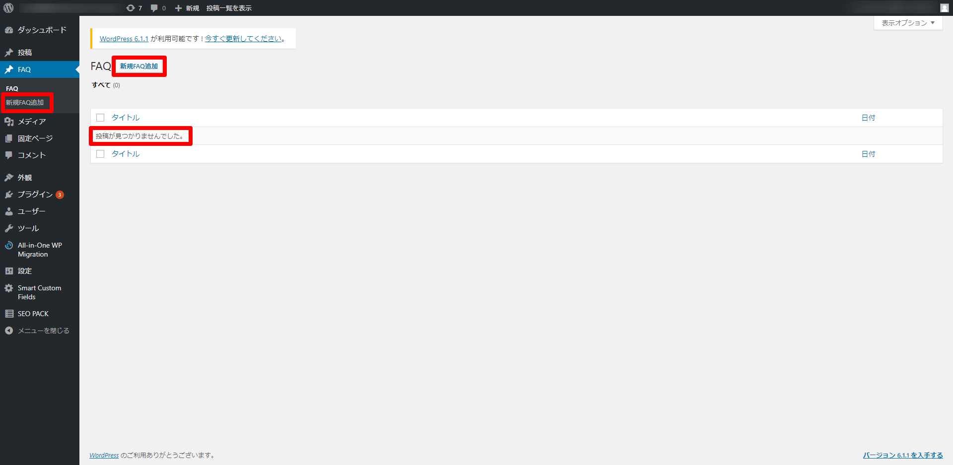 'label' => 'FAQ', // 管理画面上のカスタム投稿タイプの名前